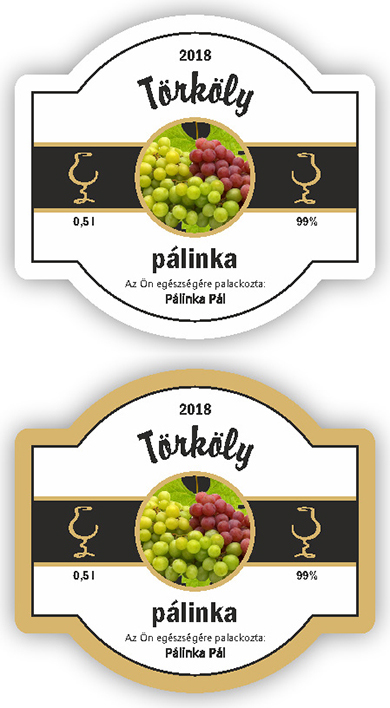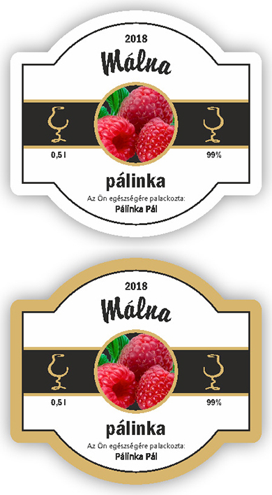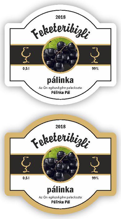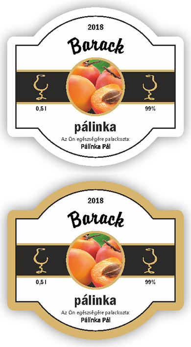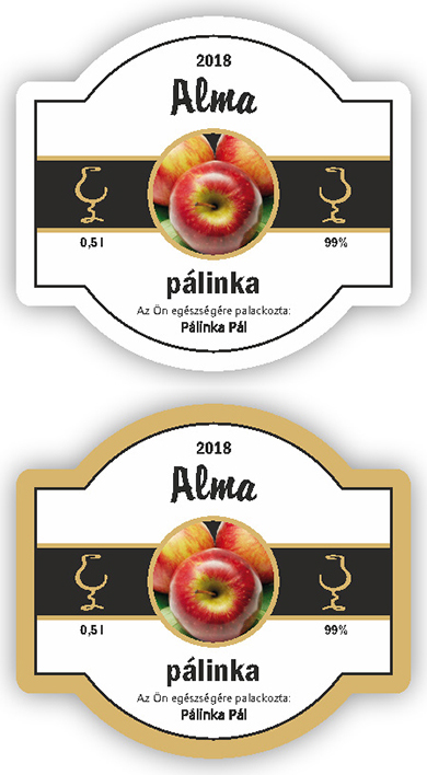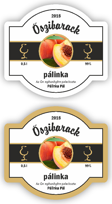 Sima háttér, Kerek alapforma. Két méretben készül (igény szerint ettől eltérő méretben is elkészítjük felár felszámítása nélkül) Kerek és hosszúkás kivitel egyaránt megtalálható, így akár „tokajis” palackokra is alkalmas. A két kerek méret 70×63 mm és 100×90 mm, a két hosszúkás a 70×91 és 70×115 mm-es méret. Alapból három arculat készült, de egyedi igény alapján a címkék háttere külön díjazás nélkül változtatható. Kialakítottunk fehér és aranysárga szegélyt valamennyi címkénél. Közel 70 féle gyümölcs és zöldség variációban készülhetnek. Az alábbi címkék nem fedik le a rendelhető gyümölcs választékot, csupán bemutató célt szolgálnak. Az ajánlatkérést (rendelést) követően elküldjük e-mailben a kért címke változatot.